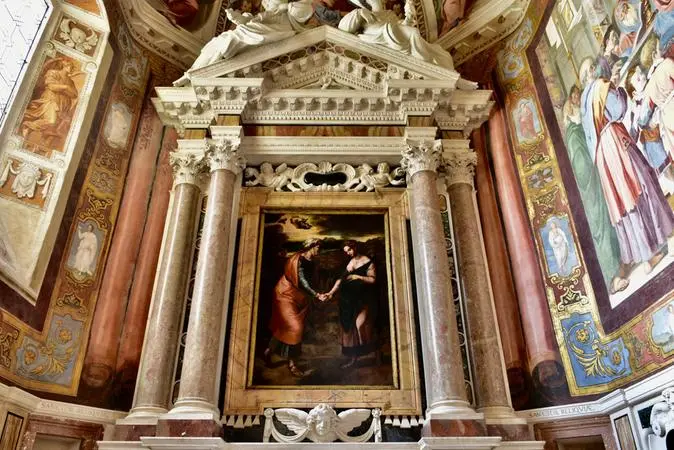 «Il primo piano rende maestose le figure di Maria ed Elisabetta, mentre sullo sfondo il Battesimo di Cristo segue temporalmente il loro incontro, creando una narrazione teologica che unisce devozione familiare e storia sacra».