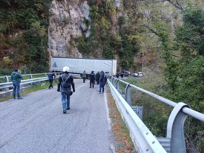 Un lungo tir resta incastrato nel tentativo azzardato di fare manovra lungo la tortuosa strada statale 479 'Sannite', finendo per bloccarsi tra la parete rocciosa e il guardrail, lungo tutta la carreggiata. Lunga fila di auto ferme da oltre un'ora e anche un autobus con a bordo gli studenti di ritorno da Sulmona verso i paesini di montagna della valle del Sagittario fino a Scanno. Necessario l'intervento dei carabinieri e dei vigili del fuoco, che hanno tagliato parte del guardrail per disincastrare il mezzo e consentire all'autista, con manovre lente e precise, di liberare progressivamente la strada. Unico collegamento tra la valle del Sagittario e quella Peligna, la suggestiva SS 479, incastonata tra i monti, è anche di grande richiamo turistico per la bellezza panoramica delle Gole del Sagittario. Spesso soggetta a rallentamenti per via della carreggiata stretta, raramente viene attraversata da mezzi tanto imponenti.