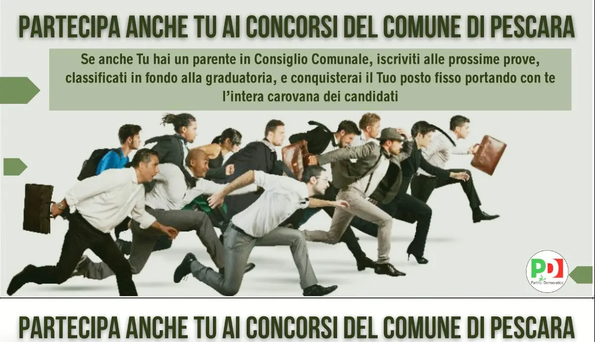 PESCARA. «Se anche tu hai un parente in consiglio comunale, iscriviti alle prossime prove, classificati in fondo alla graduatoria e conquisterai il tuo posto fisso portando con te l’intera carovana dei candidati». È questo lo slogan lanciato a caratteri cubitali sul manifesto del Partito Democratico dopo il caos scoppiato in Comune per i concorsi pubblici e il sospetto di procedure “ritoccate” per permettere l’ingresso di determinati candidati vicini ad alcuni amministratori e dirigenti pubblici. La vicenda esplosa attorno ai concorsi pubblici comunali, non è più una polemica di giornata ma una frattura politica profonda che investe il senso stesso dell’amministrare. E il fuoco incrociato che arriva dal consigliere regionale del Pd Antonio Di Marco e dai Giovani Democratici di Nuova Pescara lo certifica senza attenuanti.