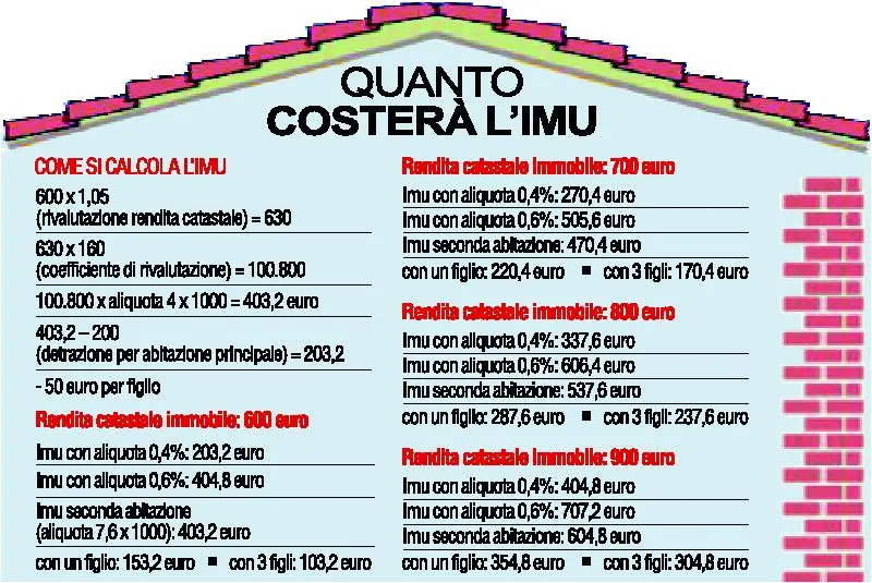 Il proprietario di un appartamento con rendita catastale di 600 euro, pagherà 203,2 euro all'anno, che scendono a 153,2 euro con un figlio e a 103,2 con tre. Per un immobile con rendita di 900 euro, il costo sale a 404,8 euro per dodici mesi, che scende a 354,8 con un figlio e a 304,8 con tre. Nella peggiore delle ipotesi, nel caso in cui l'aliquota scelta dal Comune fosse del 6 per mille, per un immobile con rendita catastale di 600 euro si pagherebbero 404,8 euro, mentre 707,2 euro per una rendita di 900 euro.