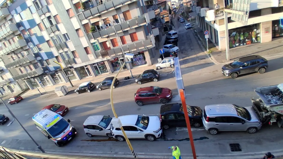Una Fiat Panda, guidata da un giovane, arriva da dietro e innesca lo scontro a catena. Coinvolto anche un mezzo dei rifiuti della Formula Ambiente: sotto accusa una distrazione