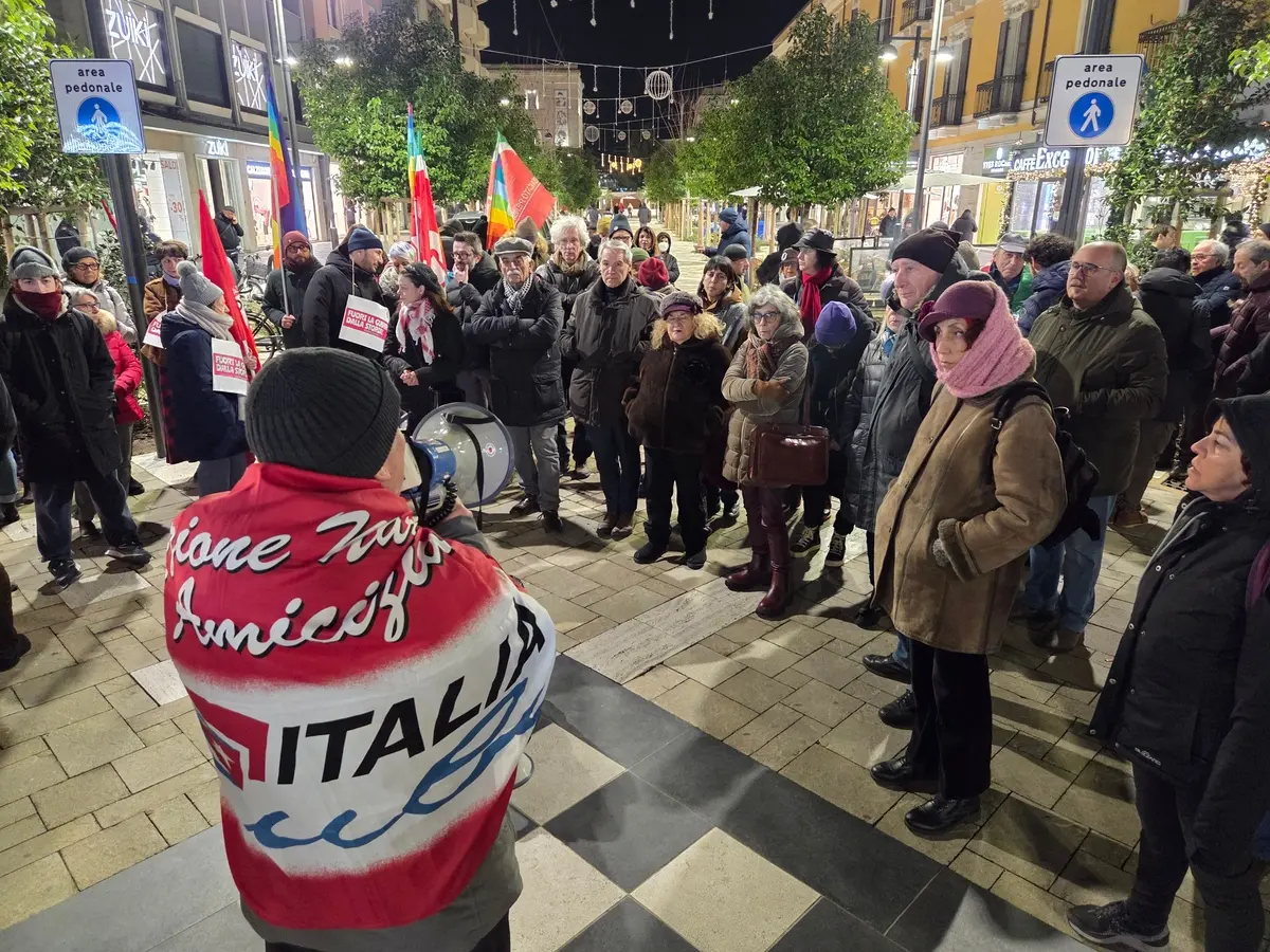 PESCARA. Cala la notte e Pescara rallenta il passo. Il rumore delle auto si fa più distante, le voci si abbassano e, in mezzo al flusso ordinario di corso Umberto, compare una frase netta, scritta a mano, sollevata come un avvertimento più che come uno slogan: «Trump: giù le mani dal Venezuela». Attorno a quel cartello, alle 18, si è raccolto un piccolo presidio – circa 50 persone – ferme nello spazio e nel tempo per dire “no” all’attacco degli Stati Uniti al Venezuela, avvenuto nella notte tra venerdì e sabato 3 gennaio. Non una piazza rumorosa, ma una presenza vigile. Un presidio misurato nei toni, composto nei gesti, eppure attraversato da una tensione profonda, politica prima ancora che emotiva.