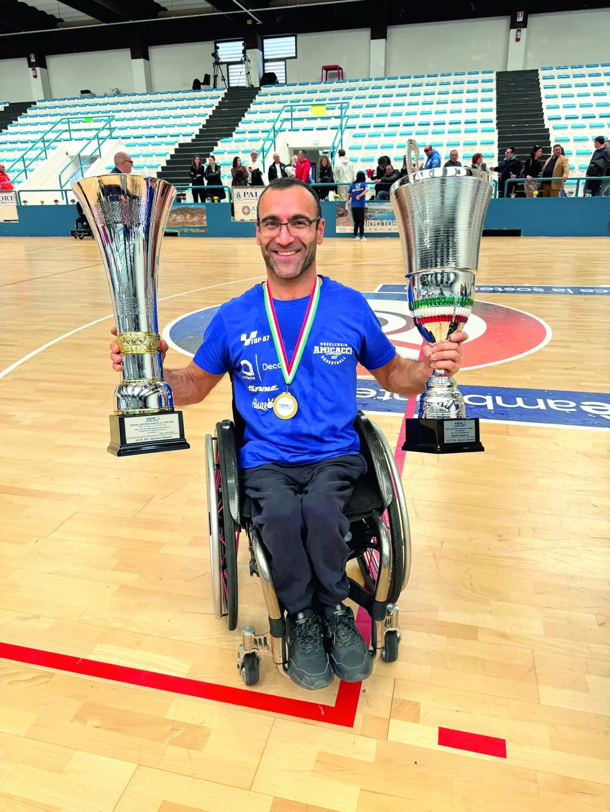 GIULIANOVA. Sono quelle storie belle che vanno raccontate perché fanno bene al cuore. È la favola bella di Oczan Gemi, o meglio del cavalier Gemi, dopo l’onorificenza che gli ha tributato il presidente della Repubblica Sergio Mattarella appena un anno fa. Nato a Batman in Turchia nel 1980 oggi è cittadino italiano. Risiede a Giulianova con la sua compagna e, dopo essere stato una colonna della squadra di basket in carrozzina dell’Amicacci, è attualmente il factotum, quello che cura l’organizzazione e dà una mano decisiva al presidente D’Angelo. «Sono arrivato a Giulianova per caso», racconta, «avevo letto che ci sarebbe svolto un torneo di basket in carrozzina, e non ce ne sono tanti, sono partito, sono arrivato, ho giocato e si può dire che da allora non sono andato via più».