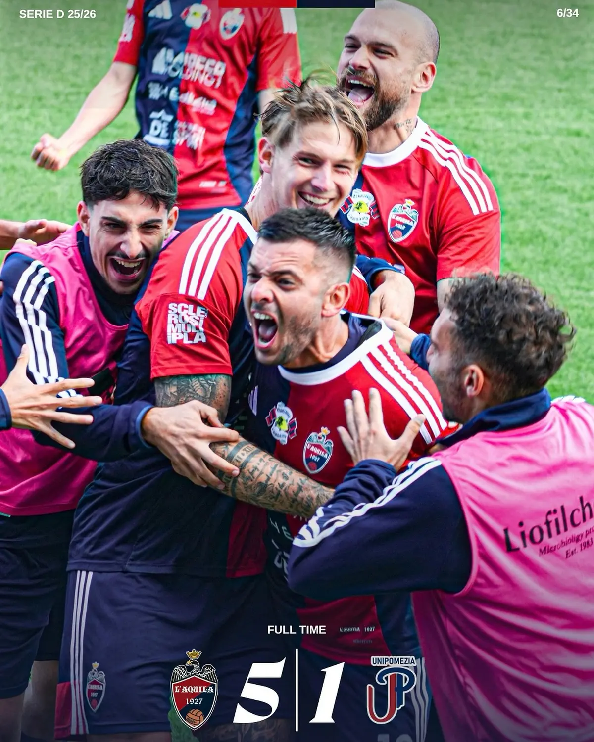 L’AQUILA. La sesta giornata del girone F di serie D è stata favorevole alle squadre abruzzesi. L’Aquila travolge il Pomezia, il Teramo rimonta e supera la Maceratese, il Chieti conquista una importante affermazione nl derby di Notaresco (1-3). Il Giulianova del nuovo corso Pergolizzi strappa il pari sul terreno della Sammaurese.