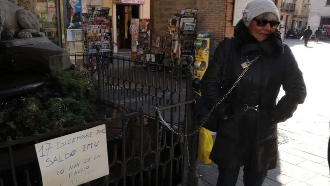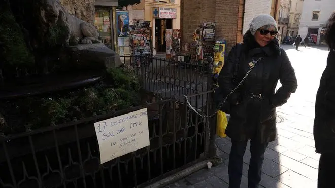 Da stamattina è legata alla fontana sotto al municipio di Teramo: “Non posso pagare”