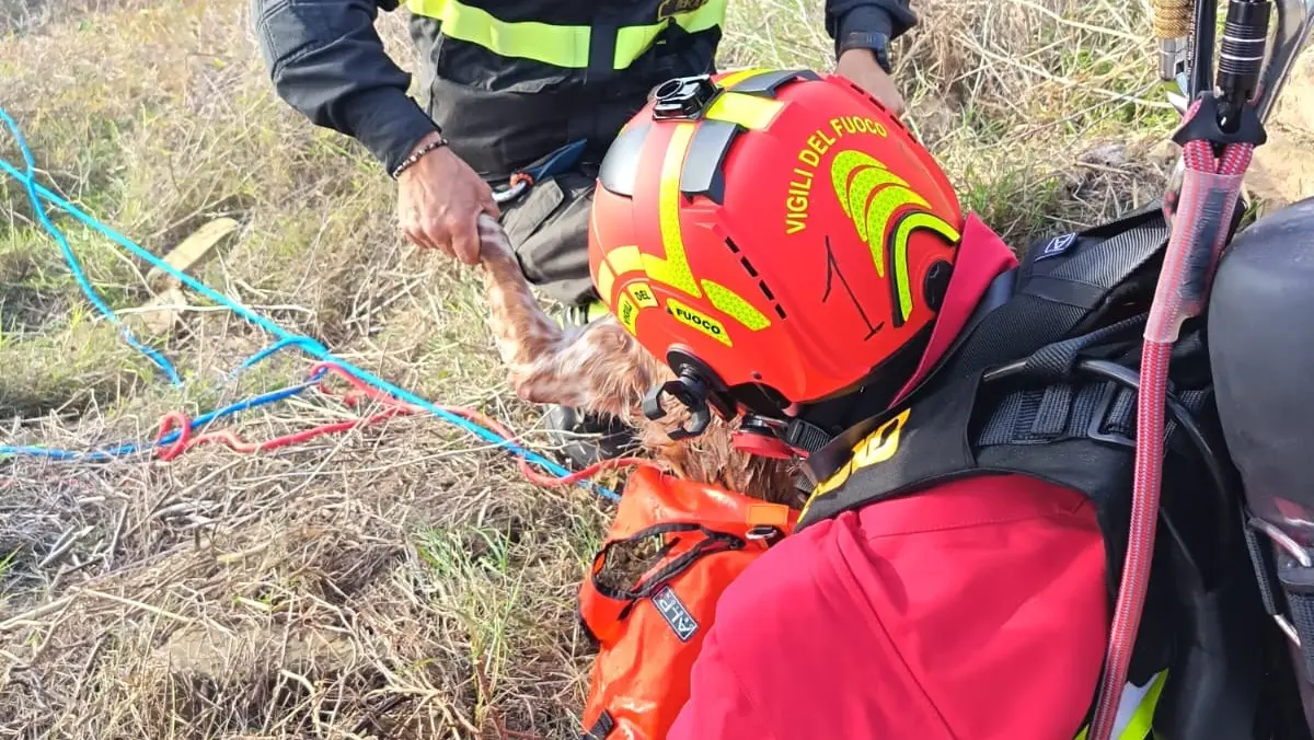 Un vigile del fuoco, dopo aver indossato una tuta Atp, si è calato all'interno, assicurato a una corda fissata all'imbraco, e ha recuperato l’animale