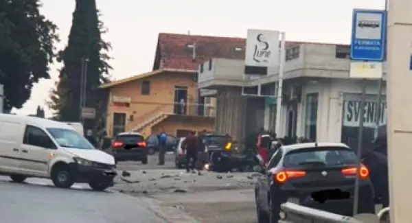 L’uomo, sbalzato dalla moto, è finito a terra mantenendo per fortuna il casco mentre lo scooter si è disintegrato in cento pezzi